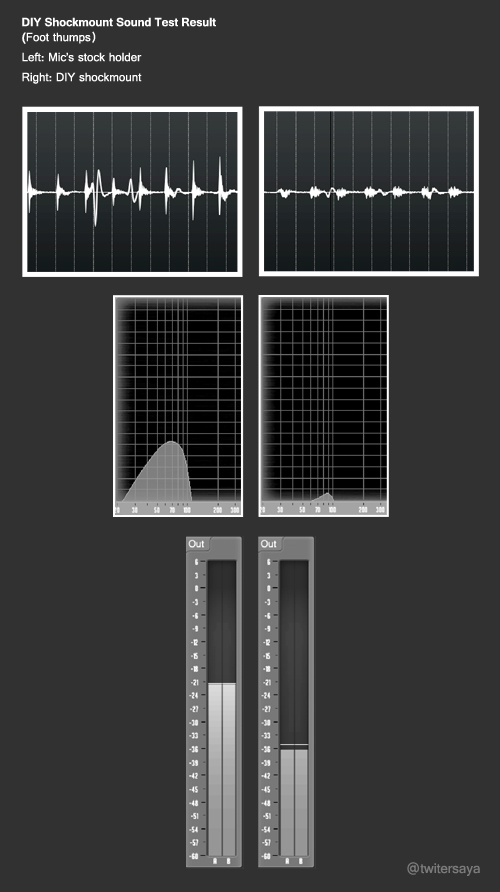 So here's the test result with foot thumps on the floor. Picture on the left is using the mic's stock holder, and on the right with DIY shockmount attached.